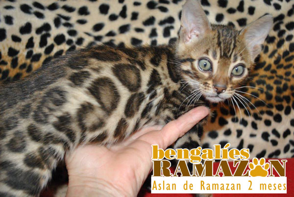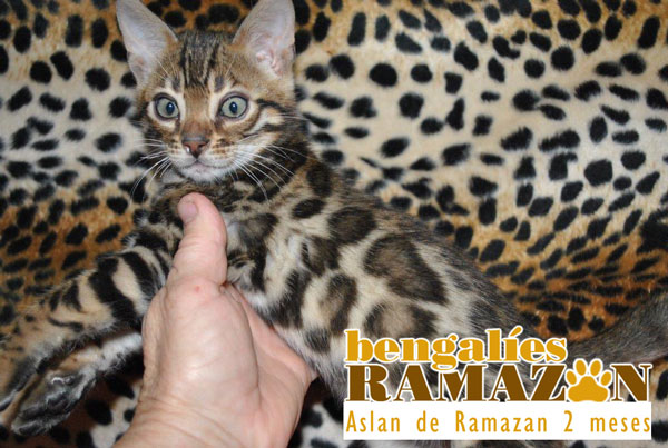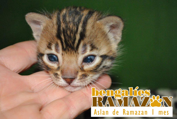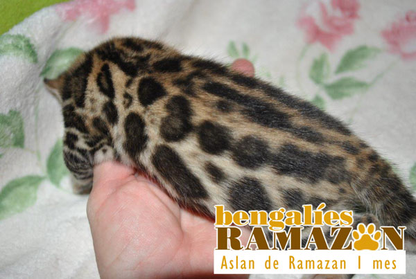 En estas fotos Aslan tiene 1 mes de edad, vemos como las orejas son pequeñitas, guardando cierta proporción con la cabeza, las manchas están bien definidas, los colores son intensos, indicando como será de adulto. Los ojos son de color azul, el tono de los bebés y chiquitines de esta edad.
