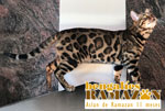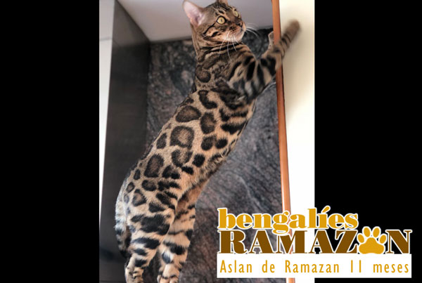 Está ya en la etapa adulta, con 11 meses, la cabeza ha crecido y está mejor proporcionada respecto a las orejas, que ya no crecen más. Conforme vaya creciendo en el próximo año, irán pareciendo más pequeñas ya que su cabeza crecerá un poco más. Se ve el cuerpo más musculado, robusto, fuerte, corpulento y grande. Los tonos de las rosetas son más intensos, asemejándose a la intensidad de un mes de edad. En una de estas fotos vemos como se le marcan los tonos anaranjados, que irán acentuándose en los próximos años. Los ojos se ven dorados, todavía se están desarrollando, es muy probable que a los dos años aproximadamente se cambien a verdes, tal y como ha pasado como su padre Ferrari, que los tuvo dorados durante los primeros años, y luego de repente se le cambiaron a verdes. La madre Gabanna los tiene verdes preciosos, es cuestión de tiempo.