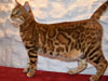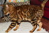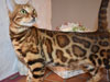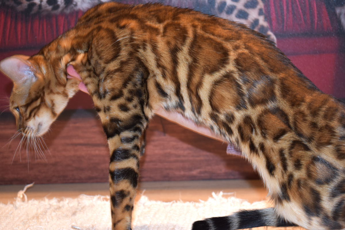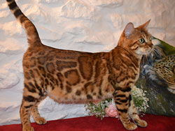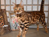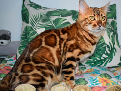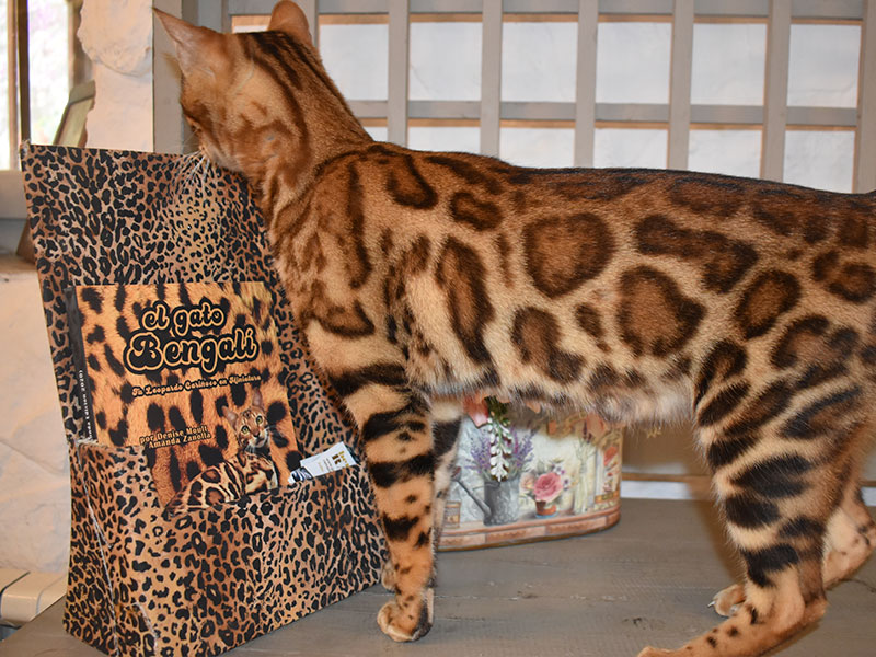Katalina de Ramazan es una hembra espectacular brown spotted bengalí nacida en nuestro centro de cría con unos tonos de manto ricos y bien contrastados sobre una base de manto crema claro. En el lado derecho tiene una roseta en forma de corazón, las demás son rondeadas tipo donut bien distribuidas por ambos lados de forma uniforme. El tacto del manto es lustroso y sedoso. Manto muy corto y pegado al cuerpo. Ojos cambiando a verde. Es de carácter sociable, juguetona y activa.