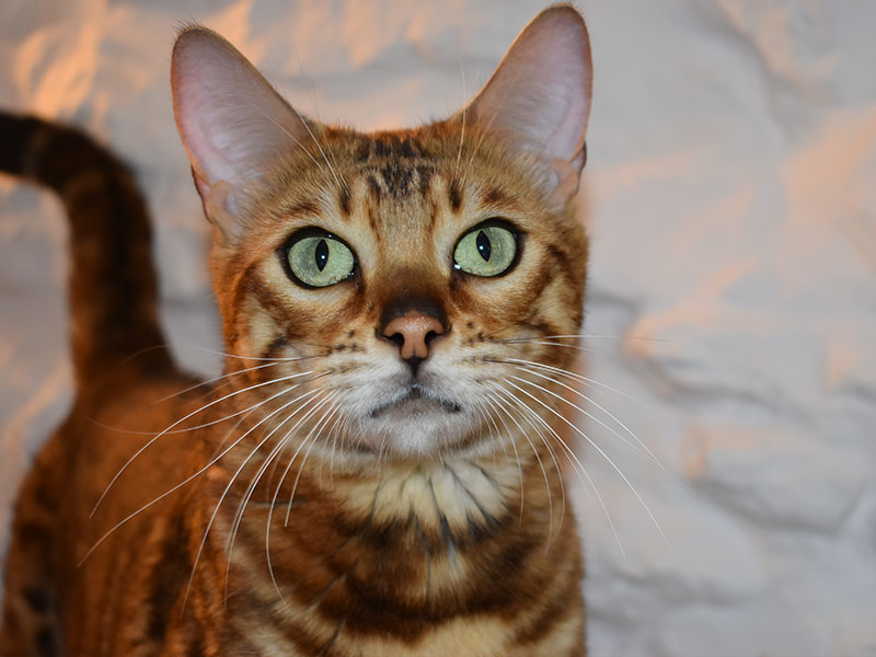 Safari de Ramazan es una fabulosa hembra brown spotted bengalí nacida en nuestro centro de cría con unos tonos cálidos de manto contrastados sobre una base de manto crema claro. Sus ojos en el proceso de cambiar a verde progresan paulatinamente. De joven tenía los ojos dorados y vemos como el verde se está potenciando y con el paso del tiempo cubrira la totalidad del iris. Cada bengalí progresa diferente con el tono verde de los ojos. Otros mantienen el tono dorado de los ojos. Es de carácter amoroso y cariñoso, muy juguetona y activa.