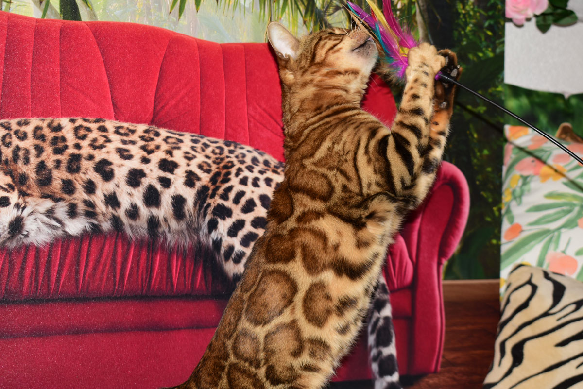Yuliana es una hembra de alto impacto de tonos vivos fuego y contorno de rosetas muy contrastadas. Con unos ojos verdes que enamoran, su manto está repleto de rosetas redondeadas tipo donut de buen tamaño, bien colocadas, de forma uniforme en ambos lados. Su carácter no podría ser más precioso, extremadamente afectuosa, cercana y queriendo estar contigo siempre.
