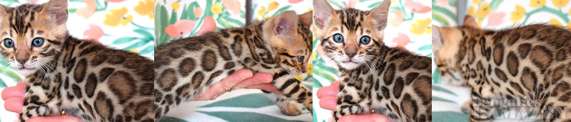 Description: Amazing brown spotted female kitten with fabulous rounded rosettes, superb contrast, rich colour already showing in the middle of the rosettes, big body. Green eyes in adulthood. Lovely nature.